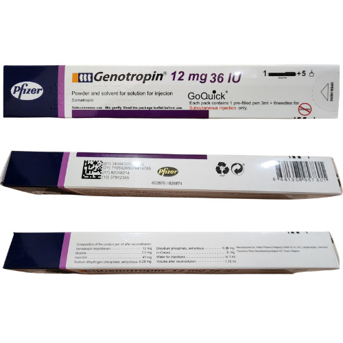 Genotropin (somatropin) 12 mg (36 IU) in a 3 ml cartridge is a recombinant human growth hormone used primarily for treating growth failure in children and adults with growth hormone deficiency.